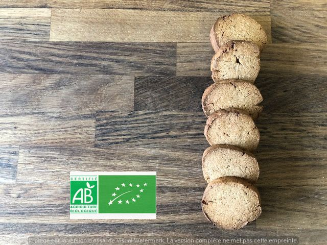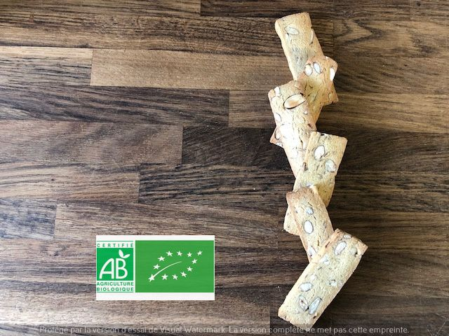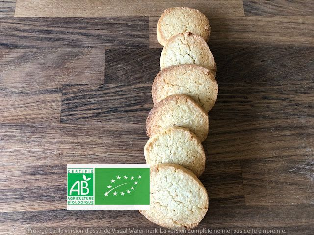 Croquants amandes : Farine T80, Oeufs, Sucre, Beurre, Amandes.