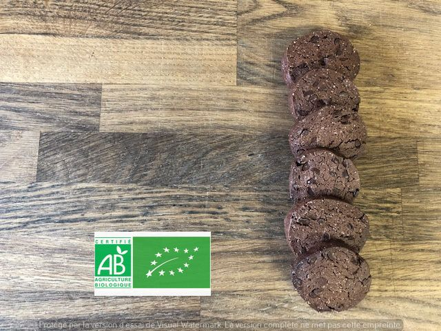 Chocolat : Farine T80, Beurre, Oeufs, Sucre, Pépites de chocolat, Cacao en poudre, Bicarbonate, Sel.